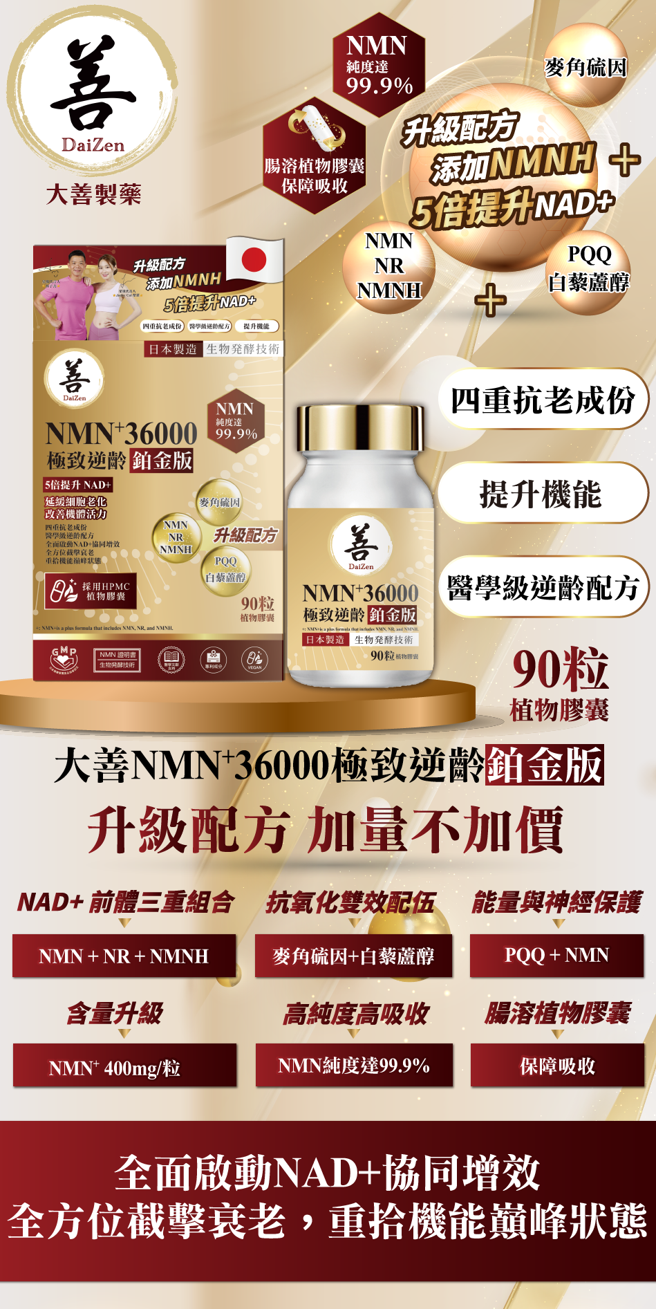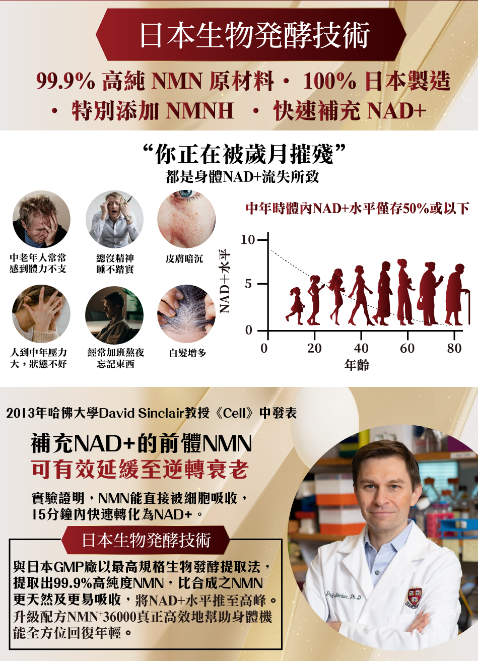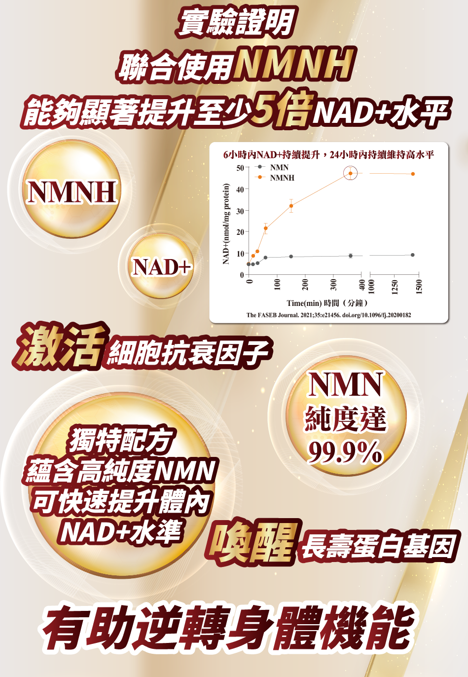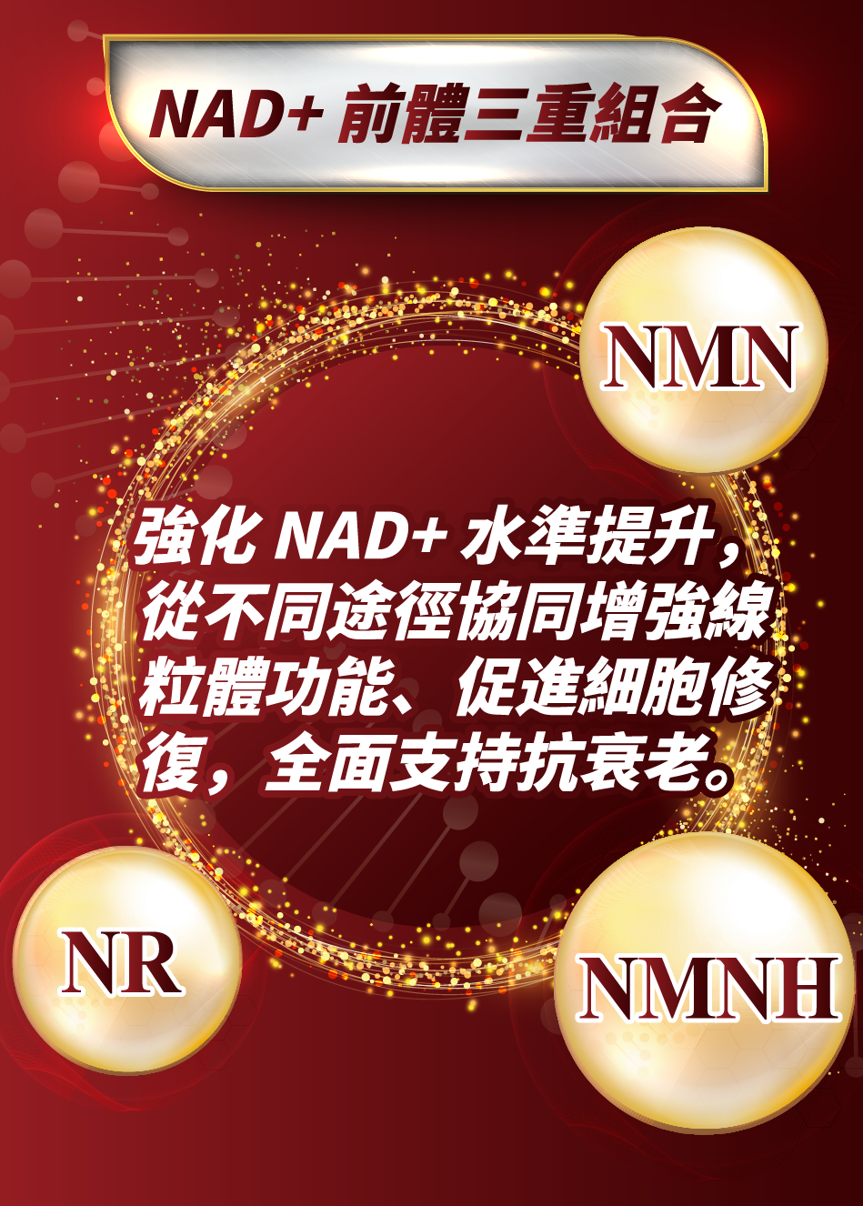 NMN:以頂尖技術提取純度99.9%的NMN,將體內NAD+水準推至高峰。有助於維持量的正常代謝,增進皮膚、