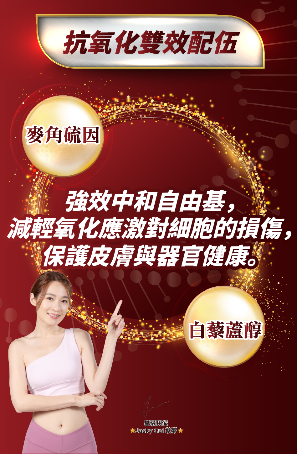 L-麥角硫因:屬於天然的氨基酸,具有強效的抗氧性,可保護線粒體,避免粒線體的DNA損傷,從而延緩衰老