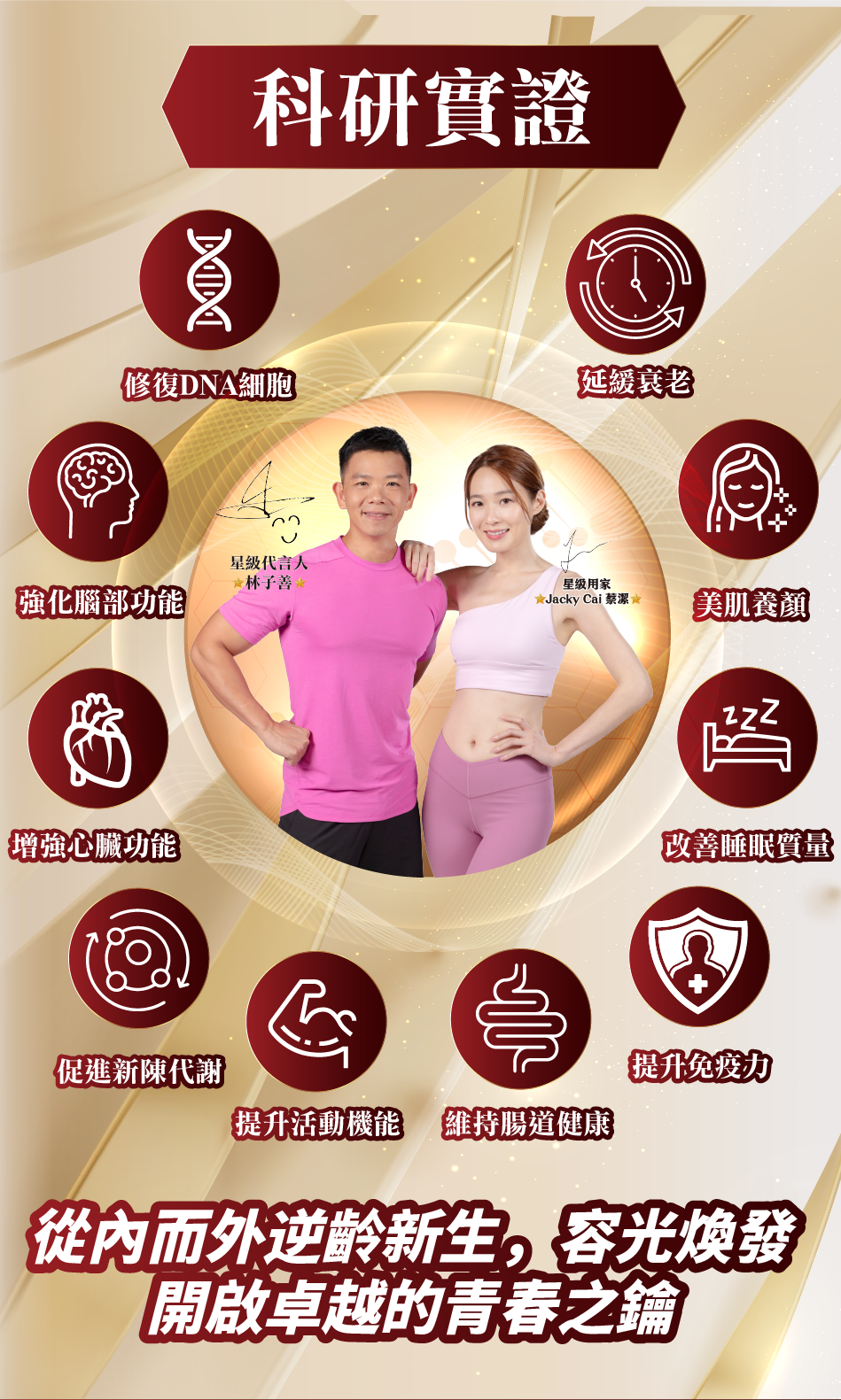 科研實證:提升免疫力、美肌養顏、增強心臟功能、提昇活動機能、改善睡眠質量、維持腸道健康、強化腦部功能